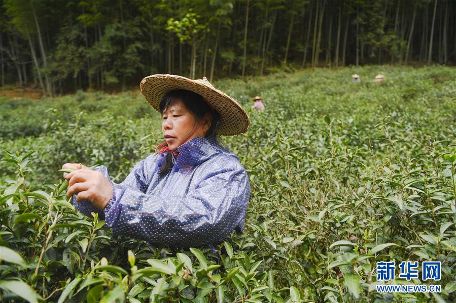 4月10日,在福建省武夷山国家级自然保护区桐木村,来自江西上饶的采茶工张水翠在采摘金骏眉鲜叶。 新华社记者 宋为伟 摄