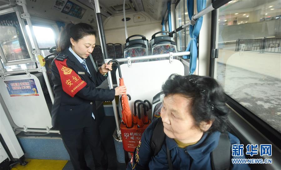 4月11日,一名公交车司机将“暖心伞”放置在公交车上。 近日,杭州公交启动“暖心伞”公益活动,在11条公交线路的近250辆车上放置“暖心伞”,供乘客免费使用。乘客不用登记,只需在用完雨伞后就近放回杭州任意一辆公交车归还即可。“暖心伞”活动受到杭州市民和外地游客的“点赞”。 新华社发(龙巍 摄)