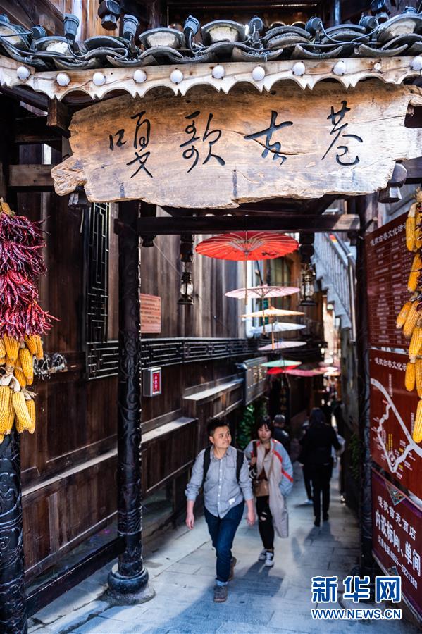 4月11日,游客在雷山县西江千户苗寨景区内观光游玩。 春季里,贵州省黔东南苗族侗族自治州雷山县西江千户苗寨,树木吐绿,春意盎然,吸引不少游客前来观光游玩。 新华社记者 陶亮 摄