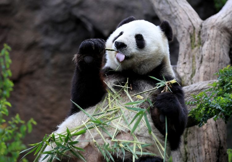 4月6日,在美国圣迭戈动物园熊猫馆,大熊猫“白云”在吃竹子。(新华社记者 李颖 摄)
