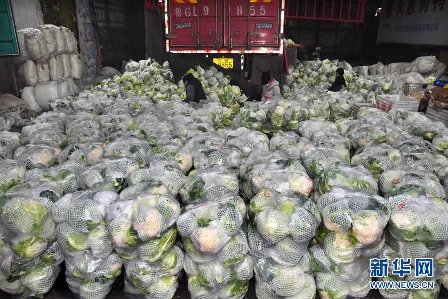 4月12日清晨,寿光农产品物流园理货区的商户在整理花菜,准备装车运往北京新发地农产品批发市场。新华社记者李紫恒摄