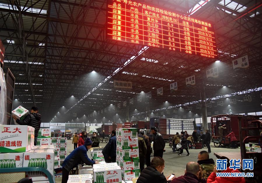 4月12日清晨,寿光农产品物流园中的蔬菜交易大厅内一派繁忙景象。新华社记者李紫恒摄