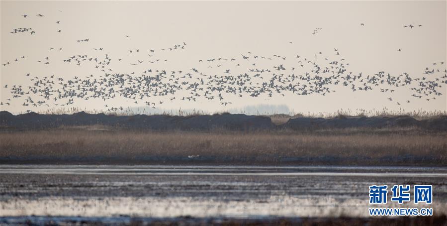 4月11日,在莫莫格国家级自然保护区,成群候鸟从湿地上空飞过。新华社记者 张楠 摄