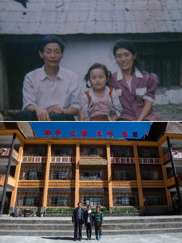 拼版照片,上图:1993年在独龙江乡小学拍摄的独龙族群众高德生、高琼先和黎英(从左到右)一家三口(资料照片);下图:2016年11月23日在独龙江乡中心小学拍摄的独龙族群众高德生、高琼先和黎英一家(从左到右)