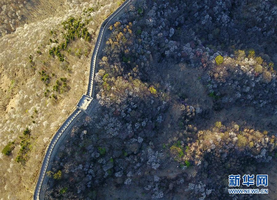 这是4月10日无人机拍摄的北京慕田峪长城。 慕田峪长城位于北京市怀柔区境内,距北京城区73公里,是明长城的精华所在。春天一到,长城两侧山花烂漫,景色格外迷人。 新华社记者 张晨霖 摄