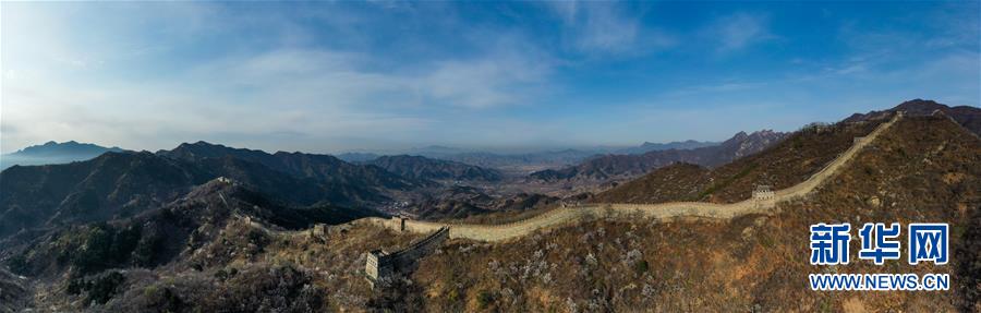 这是4月11日无人机拍摄的北京慕田峪长城(拼接照片)。 慕田峪长城位于北京市怀柔区境内,距北京城区73公里,是明长城的精华所在。春天一到,长城两侧山花烂漫,景色格外迷人。 新华社记者 王建华 摄