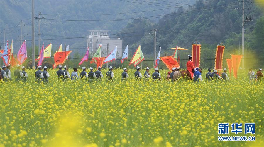 4月13日,洞桥镇贤德村的村民们身着传统服饰,在乡村田野中上演“状元巡游”,让游客感受传统的状元文化(无人机拍摄)。 新华社记者 徐昱 摄