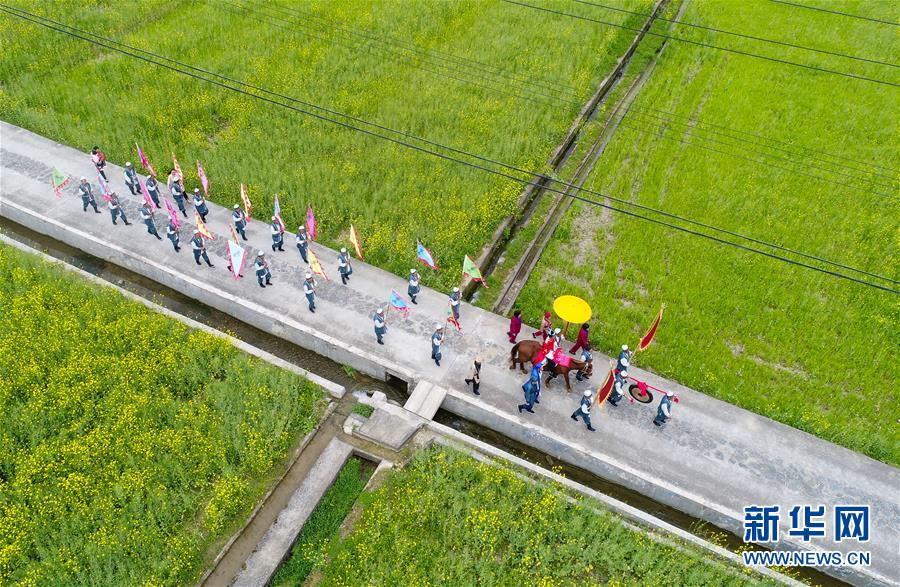 4月13日,洞桥镇贤德村的村民们身着传统服饰,在乡村田野中上演“状元巡游”,让游客感受传统的状元文化(无人机拍摄)。新华社记者 徐昱 摄