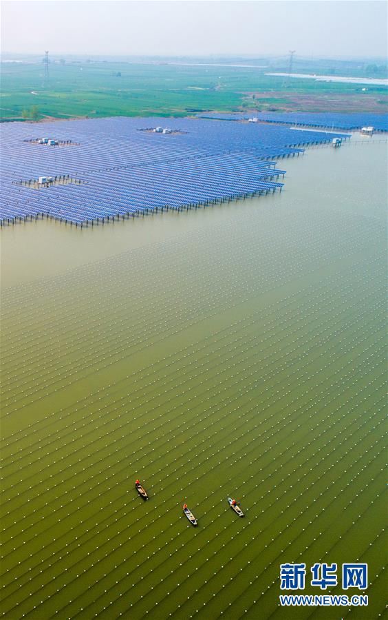 4月12日,在江苏泗洪魏营镇先锋水库,珍珠养殖人员在投放珍珠蚌(无人机拍摄)。近年来,江苏省泗洪县魏营镇围绕“特色发展,生态优先”的理念,在先锋水库水面、滩涂引进装机容量15兆瓦的光伏发电项目,同时发展珍珠养殖2000余亩,尝试光伏发电和渔业养殖的立体生产,使水库滩涂变成脱贫攻坚、乡村振兴的“金库”。新华社发(张连华 摄)