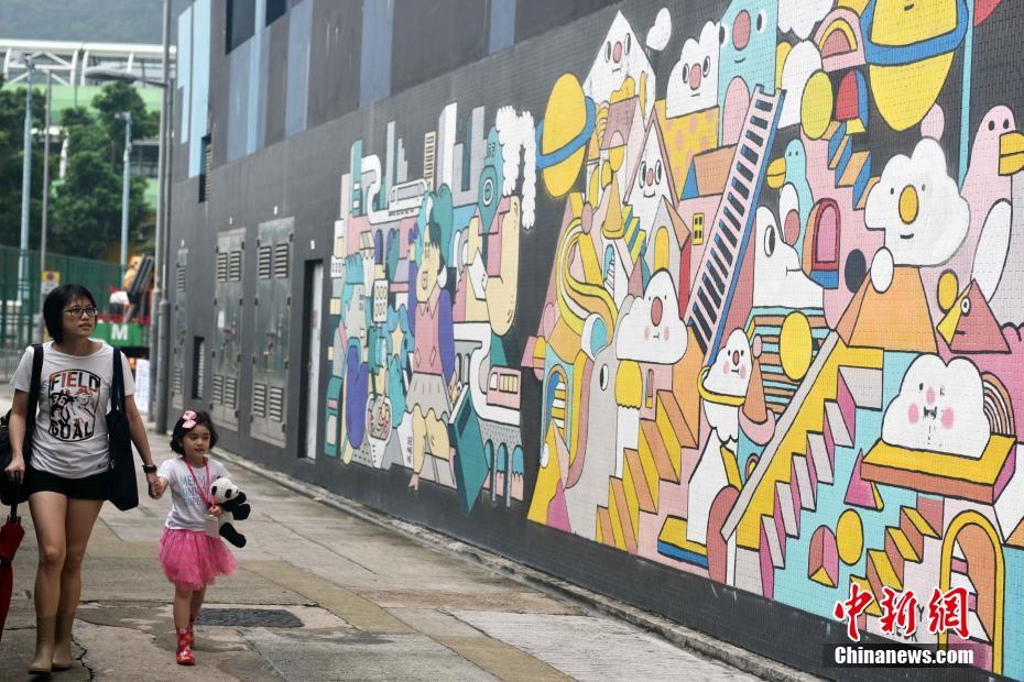 4月13日,行人途经充满艺术气息的黄竹坑壁画,这些在奧华酒店?南岸门口和旁边小路的墙壁上,出自不少艺术创作者的涂鸦杰作。中新社记者 洪少葵 摄