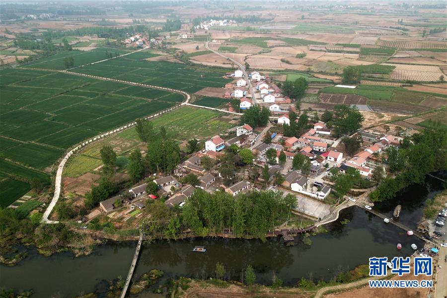 莺河村鸟瞰(4月13日无人机拍摄)。 莺河村是湖北襄阳宜城市一个仅有551户、2231人的小村庄。2016年以来,莺河村紧抓美丽乡村建设契机,引导农民改造旧居,建设“莺河人家”,凸显“看得见山、望得到水”的风光定位,吸引四方游客。2018年,莺河村共接待游客20万人次。 新华社记者 程敏 摄