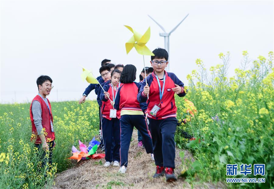 4月13日,小学生们在志愿者指导下感受小风车通过风力产生转动的能量。 当日,浙江省慈溪市“钱海军志愿服务中心”的志愿者带领小学生们来到慈溪风电场开展“星星点灯”绿色科普课堂活动,用实地参观、绿色能源科普课和手工制作风车等方式向孩子们普及风电知识,培养他们的环保意识。慈溪风电场共安装有33台单机容量1500千瓦的风力发电机组,年发电量超过1亿千瓦时,是浙江省风力发电示范项目。 新华社记者 徐昱 摄
