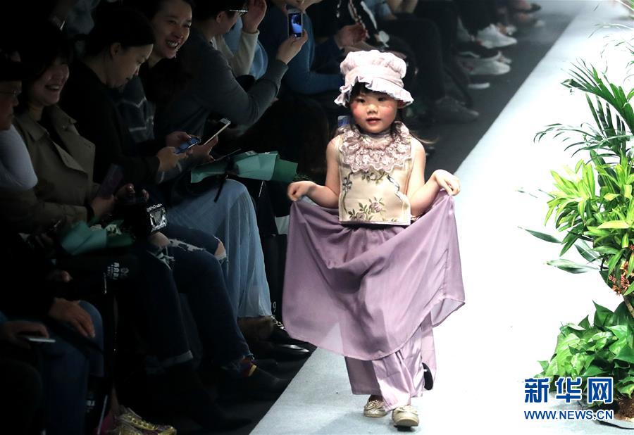4月13日,小模特在展示设计师李想的童装作品。当日,场景化童装品牌“理想在左”在上海举行主题为“筑梦·Dream Architect”的发布秀。新华社记者 陈飞 摄