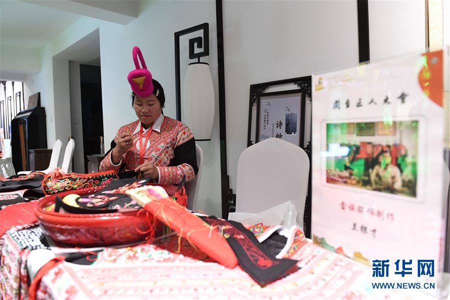 4月13日,来自福建罗源县的畲族妇女在闽台匠人技艺和作品展上展现畲族服饰编织。