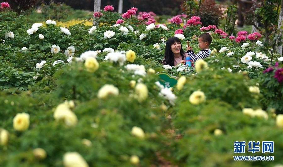 4月13日,游客在随县尚市镇的牡丹产业示范基地游玩。