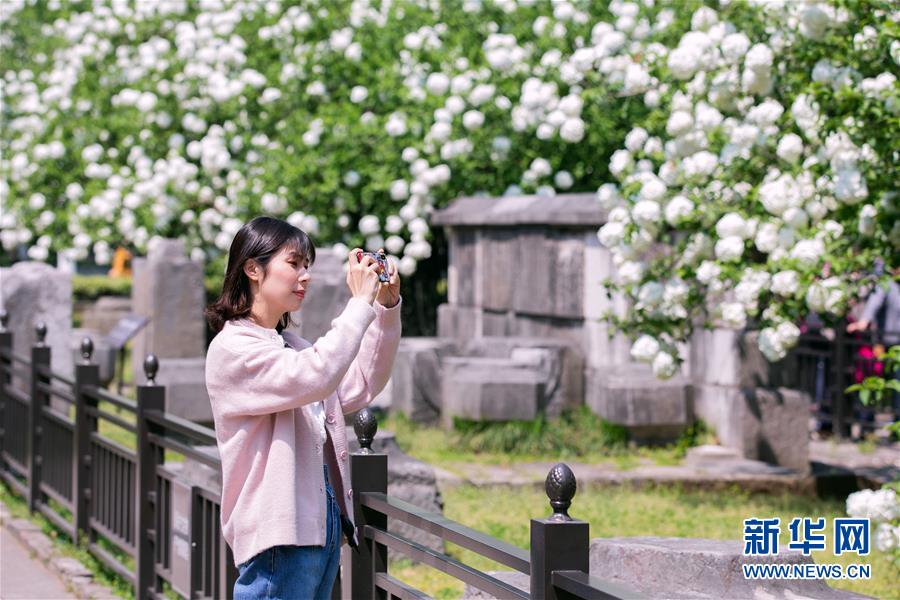 4月13日,一名游客在江苏南京午朝门公园拍摄盛开的绣球花。新华社发(苏阳 摄)