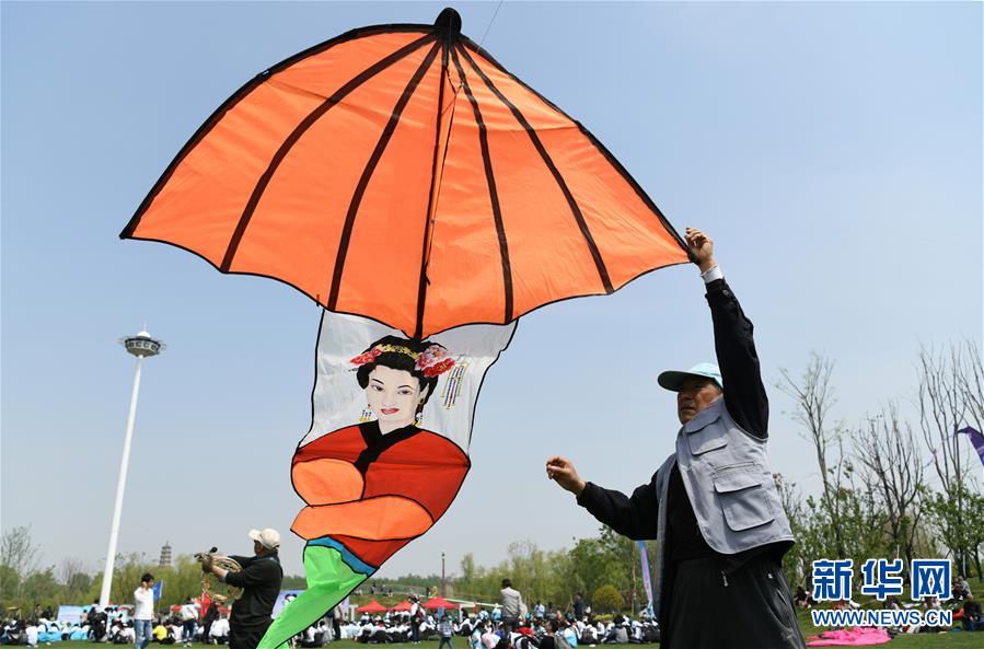 4月13日,一名参赛选手在安徽阜阳市举办的风筝赛上放飞风筝。新华社发(戴文学 摄)