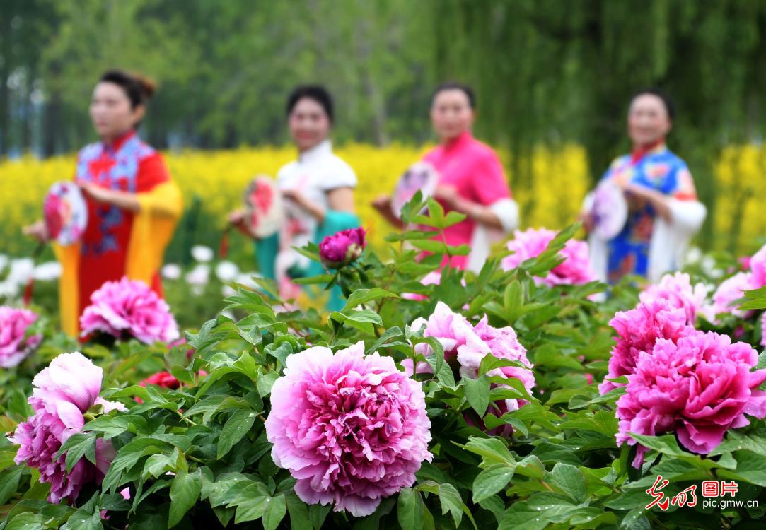 随着气温的回暖,该镇百余品种4万余株牡丹争相怒放,形成颇为壮观的牡丹花海,尽展最美乡村魅力。(曹政摄/光明图片)