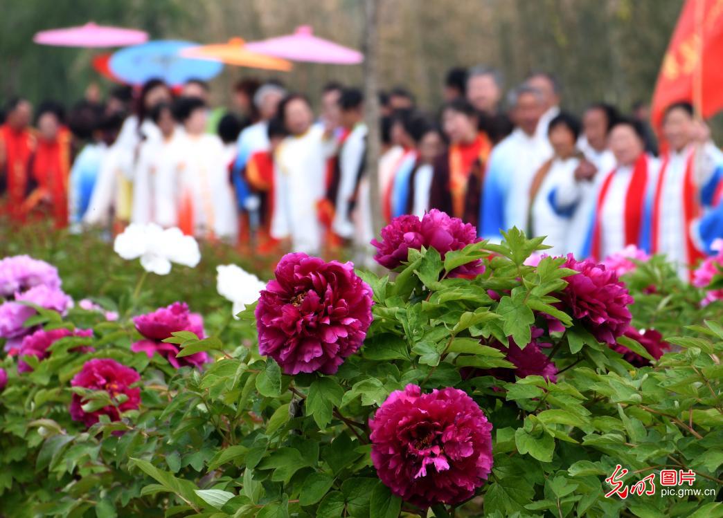随着气温的回暖,该镇百余品种4万余株牡丹争相怒放,形成颇为壮观的牡丹花海,尽展最美乡村魅力。(曹政摄/光明图片)