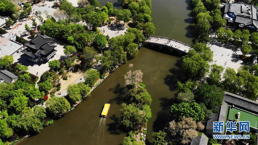 4月14日,游客在济南大明湖景区游玩(无人机拍摄)。连日来,济南大明湖春风拂柳、草长莺飞,一派春色盎然、生机勃勃的景象,吸引游客前来欣赏。 新华社记者王凯摄
