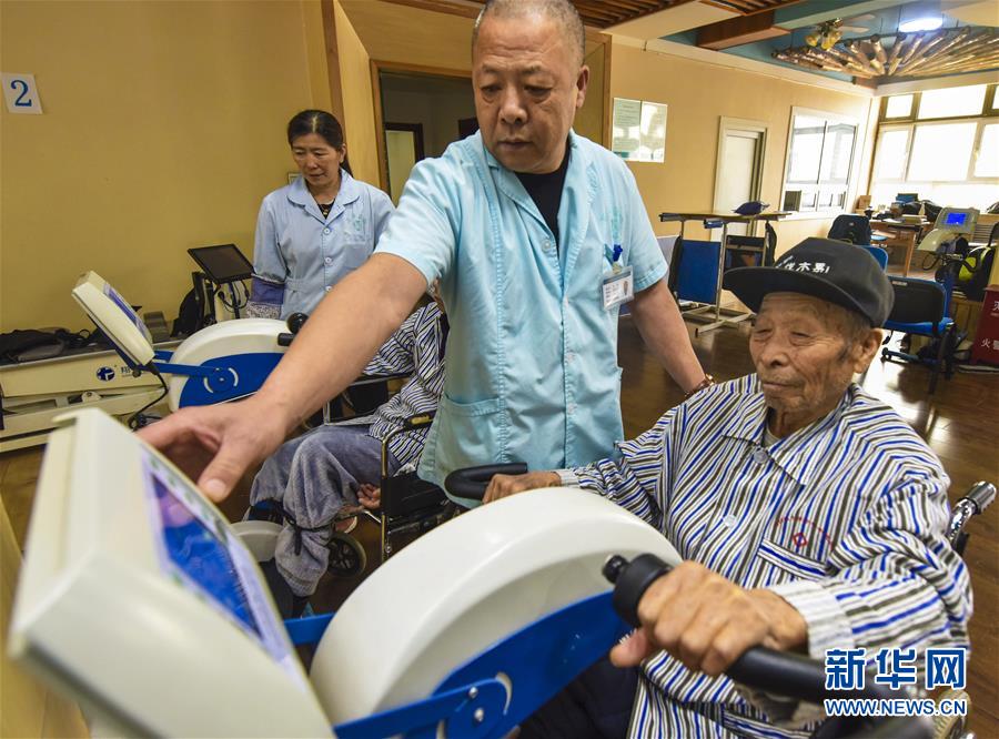 4月14日,在河北省廊坊市广阳区奥韵社区医养结合服务中心,医护人员帮助老人进行上下肢康复训练。 近年来,河北省廊坊市广阳区积极创新社区医养结合模式,打造集文化生活、疾病治疗和康复保健于一体的社区养老服务中心,帮助老人乐享晚年。 新华社记者 李晓果 摄
