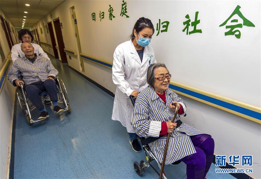 4月14日,在河北省廊坊市广阳区奥韵社区医养结合服务中心,医护人员推送老人去进行康复治疗。 近年来,河北省廊坊市广阳区积极创新社区医养结合模式,打造集文化生活、疾病治疗和康复保健于一体的社区养老服务中心,帮助老人乐享晚年。 新华社记者 李晓果 摄