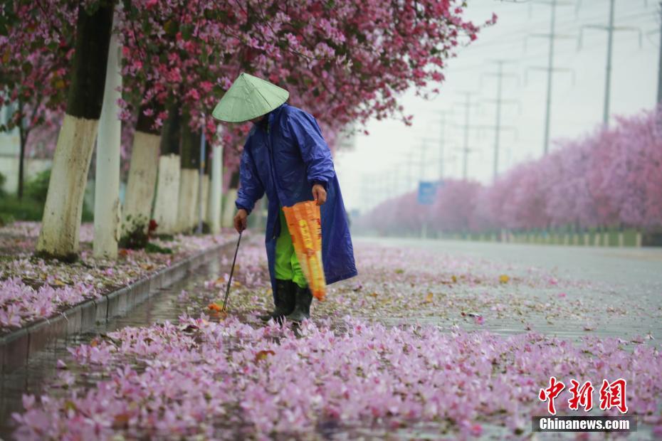 清洁工在满是紫荆花的街道上清理垃圾。 朱柳融 摄