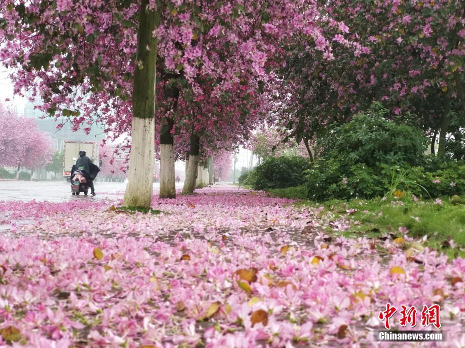 紫荆花如雨般凋落,道路变成粉红色。 朱柳融 摄