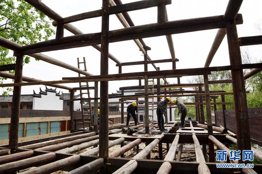 4月13日,在安徽铜陵义安区西联镇犁桥老街,徽派建筑匠人在修复明清时期老建筑。近两年来,来自安徽黄山的40多位徽派建筑能工巧匠结集铜陵犁桥老街,采用传统方法,移建和修复面临拆毁、废弃的明清徽派老建筑。目前已完成40多栋明清老建筑的移建和修复。 新华社发(过仕宁 摄)