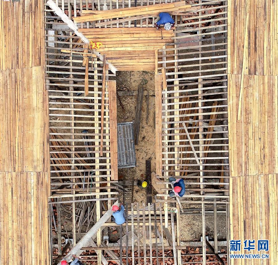 4月13日,在安徽铜陵义安区西联镇犁桥老街,徽派建筑匠人在修复明清时期老建筑(无人机拍摄)。近两年来,来自安徽黄山的40多位徽派建筑能工巧匠结集铜陵犁桥老街,采用传统方法,移建和修复面临拆毁、废弃的明清徽派老建筑。目前已完成40多栋明清老建筑的移建和修复。 新华社发(过仕宁 摄)