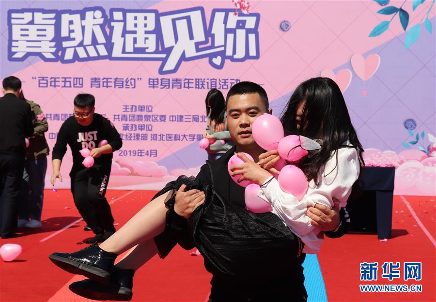4月14日,青年男女在联谊活动上玩游戏。 当日,一场以“冀然遇见你”为主题的单身青年联谊活动在河北省石家庄市举行,来自中建三局北京公司河北经理部、河北医科大学第二医院等多家单位的100多位单身青年齐聚于此,开启一场浪漫的缘分之旅。 新华社记者金良快摄