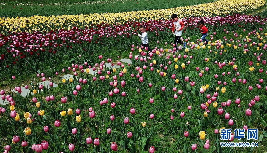 这是4月14日无人机拍摄的游客在湖北省十堰市茅箭区的秦巴生态植物园内游玩。近日,位于湖北省十堰市茅箭区的秦巴生态植物园内,200万株郁金香竞相开放,吸引游客前来赏花游览。 新华社记者 程敏 摄