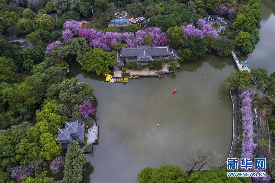 4月14日,在广西柳州市柳侯公园,盛开的洋紫荆把公园装扮得格外美丽(无人机拍摄)。 当日,一场大雨过后,广西柳州市内的洋紫荆开得格外娇艳。时下,柳州市区27万株洋紫荆进入盛花期。 新华社记者 黄孝邦 摄