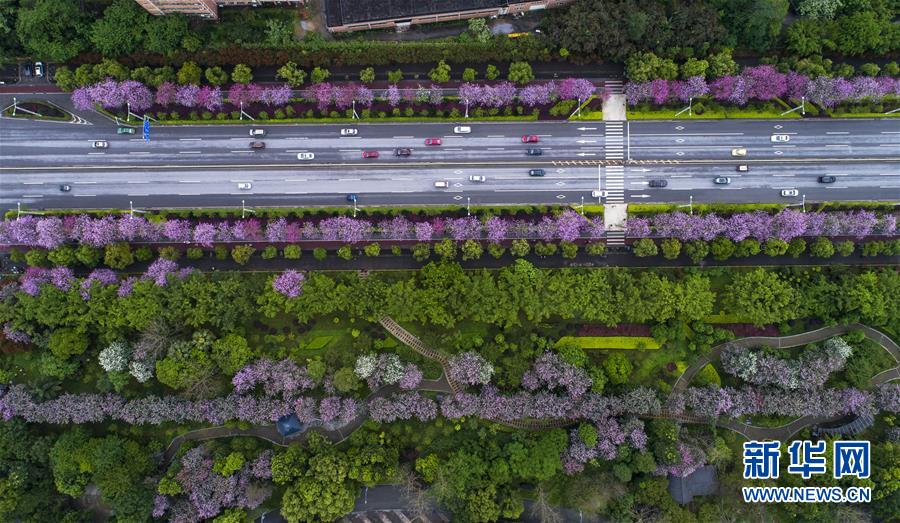 4月14日,在广西柳州市学院路,车辆在开满洋紫荆的街道上行驶(无人机拍摄)。 当日,一场大雨过后,广西柳州市内的洋紫荆开得格外娇艳。时下,柳州市区27万株洋紫荆进入盛花期。 新华社记者 黄孝邦 摄