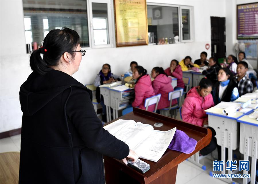 4月13日,青海省玉树藏族自治州八一孤儿学校教师在给学生上课。 (配本社同题文字稿) 新华社记者 张龙摄