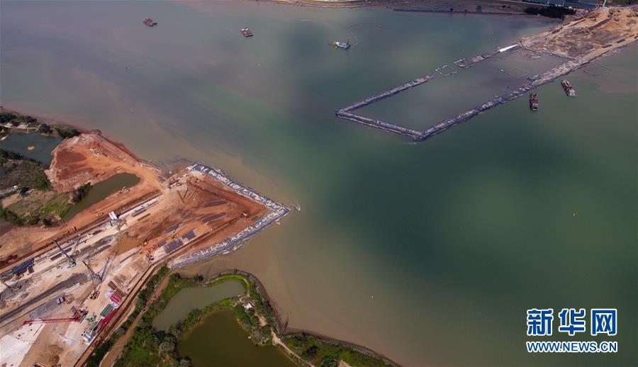 海口江东新区的文明东越江隧道在施工(2月18日无人机拍摄)。新华社记者 杨冠宇 摄