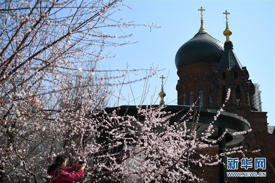 4月15日,游客在春花映衬下的索菲亚教堂前拍照。
