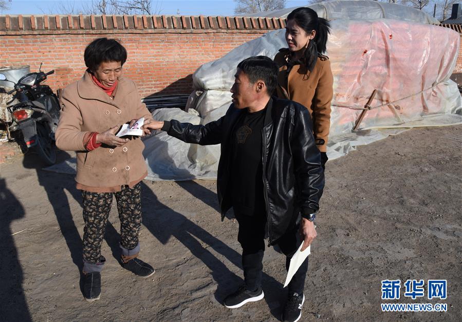 3月26日,乔福军(前右)为村民朱启云送去刚发放的残疾人证。新华社记者韩宇摄