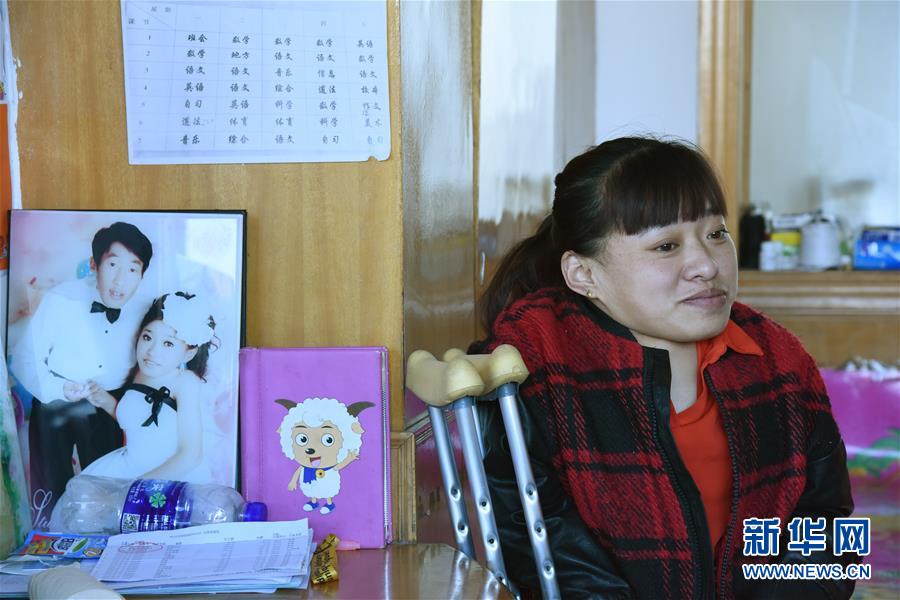 这是乔福军的妻子刘宇佳,她患先天性软骨病,腿骨极易骨折,行动离不开拐杖(3月26日摄)。新华社记者韩宇摄