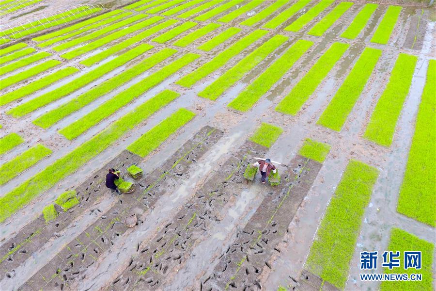 4月15日,在湖南娄底市双峰县井字镇白碧村,农民在田间忙碌(无人机拍摄)。