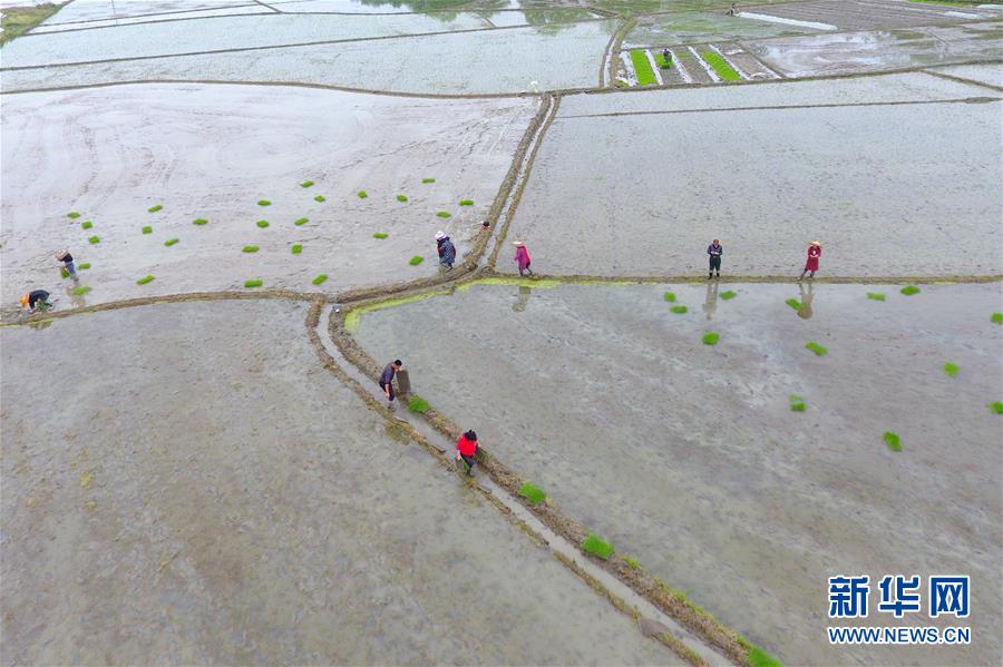 4月14日,在湖南娄底市双峰县井字镇,农民在田间劳作(无人机拍摄)。