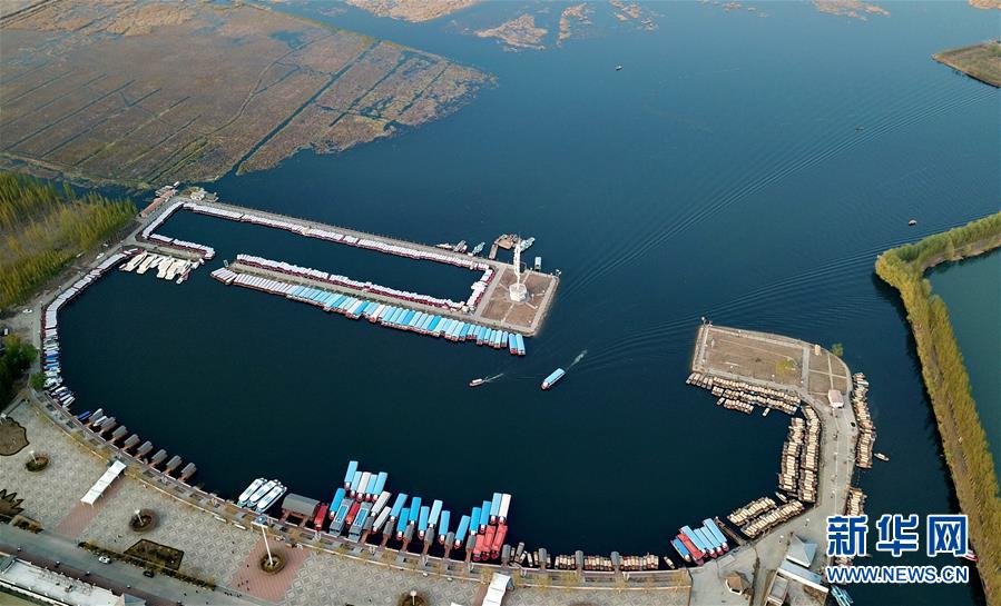 游船在白洋淀旅游码头内行驶(4月10日无人机拍摄)。新华社记者 牟宇 摄