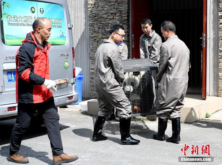 工作人员将大熊猫“园园”从隔离检疫兽舍转运出来。安源 摄