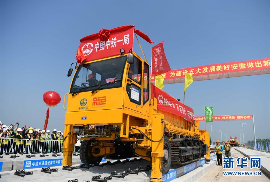 4月16日,施工人员在郑阜铁路界首南站进行铺轨作业。当日,郑阜铁路界首南站开启铺轨作业,这标志着由京福客专安徽公司建设,中建交通、中铁十局、中铁一局和中国铁建电气化局承建的郑阜铁路安徽段全线进入铺轨阶段。郑阜铁路连接河南郑州与安徽阜阳,全长267公里,设计时速为350公里,预计2019年底建成通车。新华社记者 刘军喜 摄