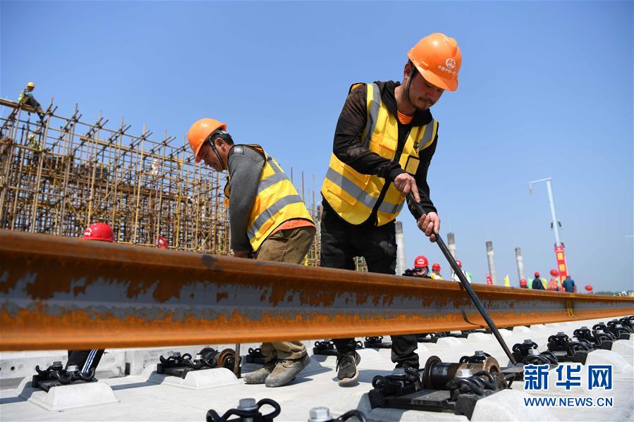 4月16日,施工人员在郑阜铁路界首南站进行铺轨作业。当日,郑阜铁路界首南站开启铺轨作业,这标志着由京福客专安徽公司建设,中建交通、中铁十局、中铁一局和中国铁建电气化局承建的郑阜铁路安徽段全线进入铺轨阶段。郑阜铁路连接河南郑州与安徽阜阳,全长267公里,设计时速为350公里,预计2019年底建成通车。新华社记者 刘军喜 摄