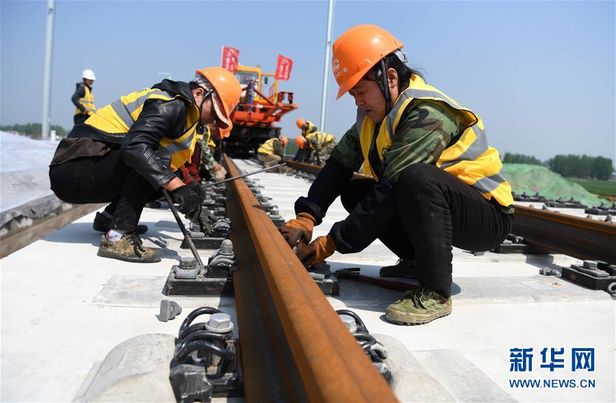 4月16日,施工人员在郑阜铁路界首南站进行铺轨作业。当日,郑阜铁路界首南站开启铺轨作业,这标志着由京福客专安徽公司建设,中建交通、中铁十局、中铁一局和中国铁建电气化局承建的郑阜铁路安徽段全线进入铺轨阶段。郑阜铁路连接河南郑州与安徽阜阳,全长267公里,设计时速为350公里,预计2019年底建成通车。新华社记者 刘军喜 摄
