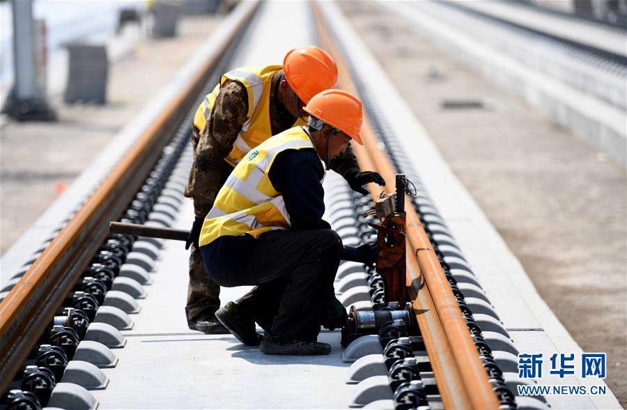 4月16日,施工人员在郑阜铁路界首南站进行铺轨作业。当日,郑阜铁路界首南站开启铺轨作业,这标志着由京福客专安徽公司建设,中建交通、中铁十局、中铁一局和中国铁建电气化局承建的郑阜铁路安徽段全线进入铺轨阶段。郑阜铁路连接河南郑州与安徽阜阳,全长267公里,设计时速为350公里,预计2019年底建成通车。新华社记者 刘军喜 摄