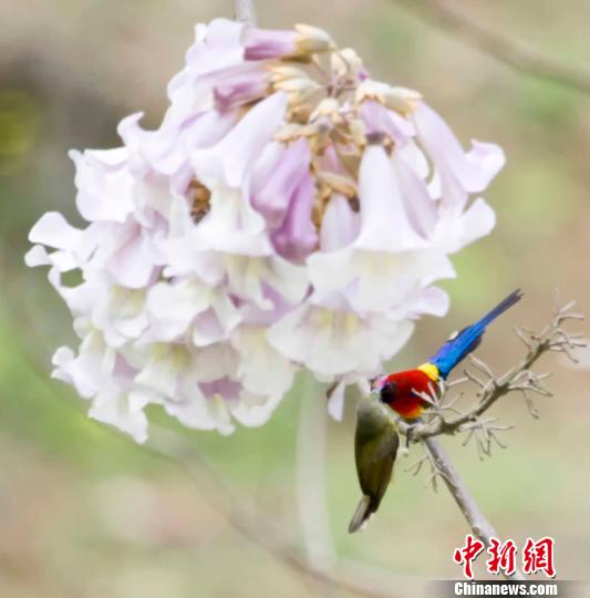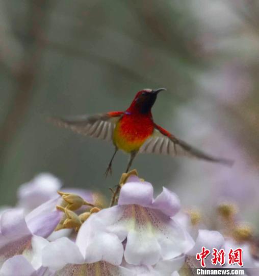 近日,湖北神农架松柏镇古水河村泡桐树已全部开花,在海拔576米的峡谷地带,蓝喉太阳鸟在泡桐树花上取食花蜜,在花间上下翻飞,相互追斗,求偶繁育。蓝喉太阳鸟是湖北省重点保护野生动物,被誉为“吉祥鸟”。