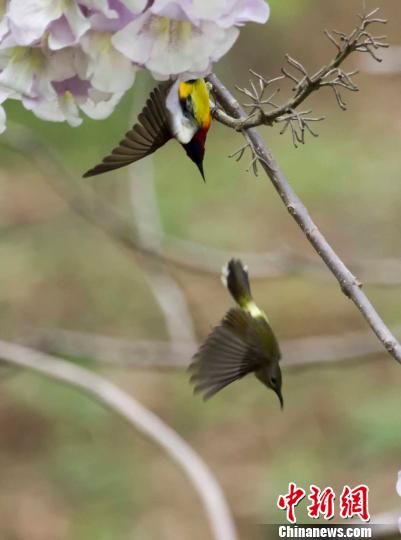 蓝喉太阳鸟相互追斗,求偶繁育 喻杰 摄