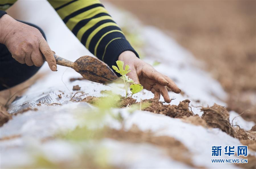 4月15日,在江西九江都昌县万户镇西湖村西瓜种植基地,一名村民栽种西瓜苗。暮春时节,在江西九江都昌县万户镇西湖村,鄱阳湖畔地膜纵横的瓜田如一条条“跑道”,当地农户运苗种苗,奔波在“跑道”上,一派繁忙的景象。新华社发(傅建斌 摄)
